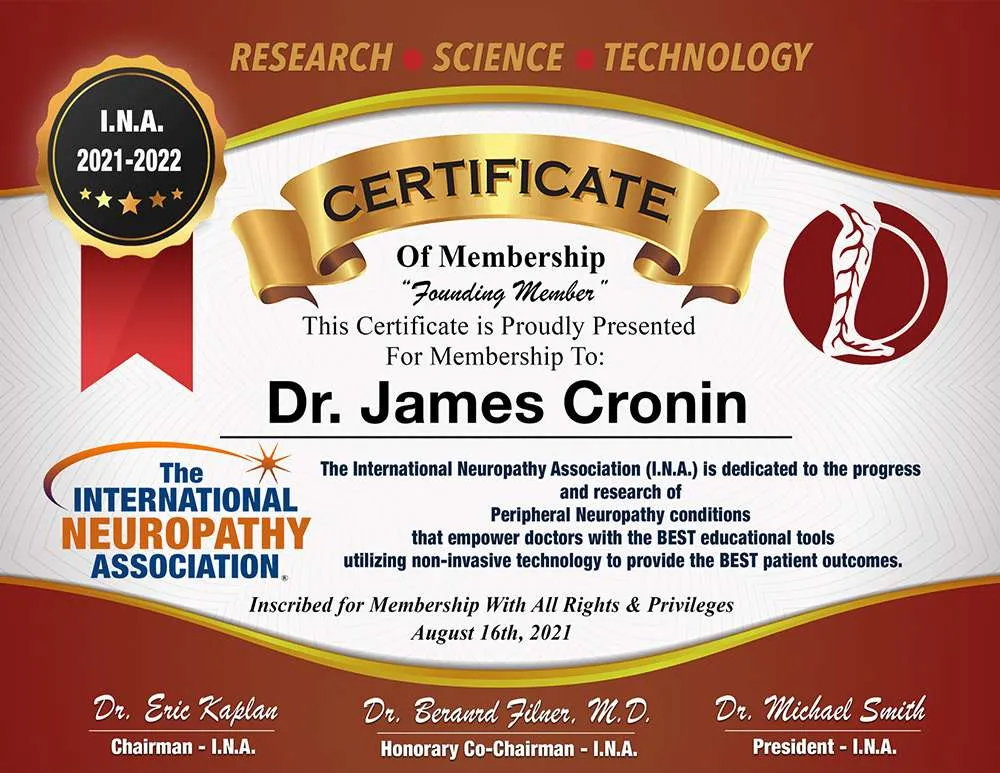 Dr. Cronin was recently recognized as one of the BEST Neuropathy Treatment Physicians in the country by The International Neuropathy Association. This advanced training and presentation took place at the Peripheral Neuropathy training facilities in Jupiter, Florida